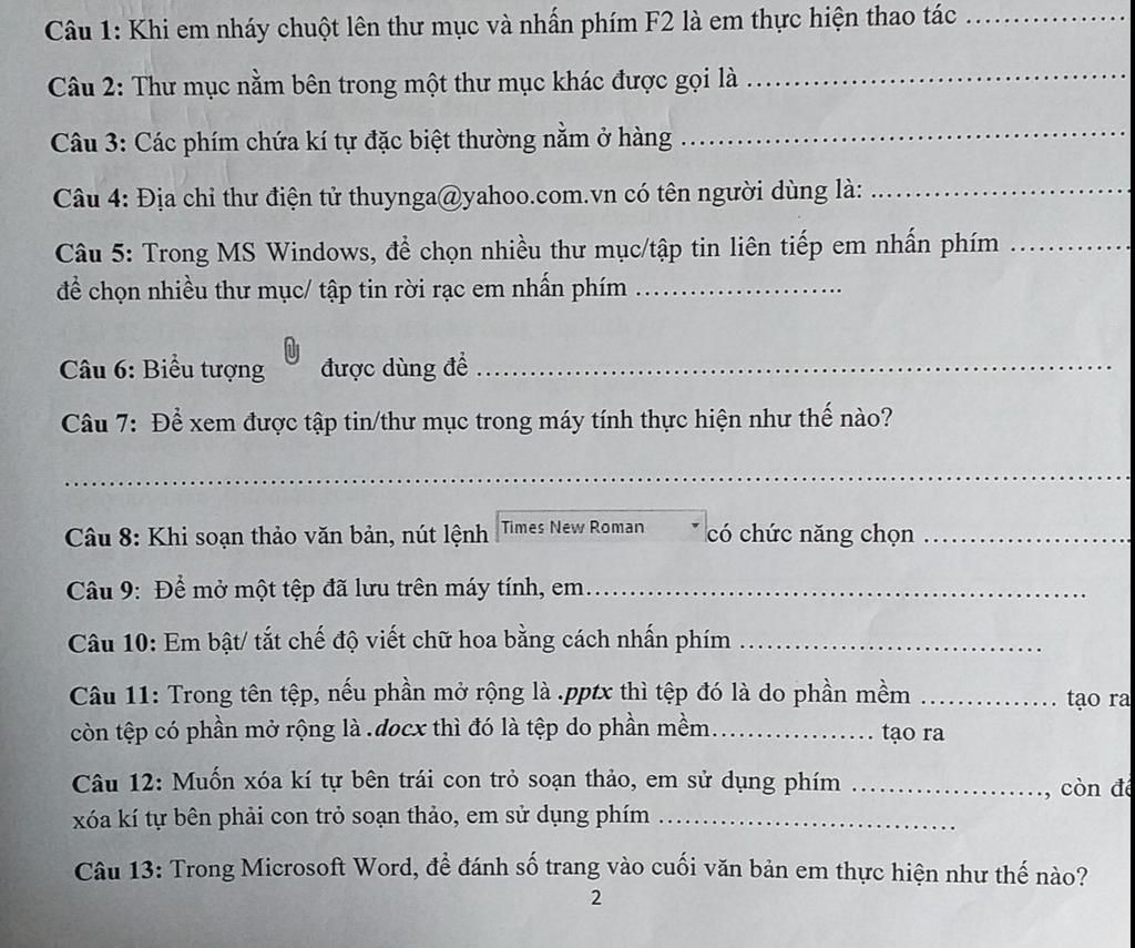 Câu 1: Khi em nháy chuột lên thư mục và nhấn phím F2 là em thực hiện thao tác