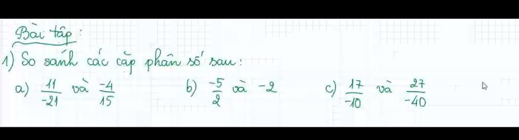 Đáp án: a)11/-21< -4/15; b) -5/2<-2; c) 17/-10< 27/-40