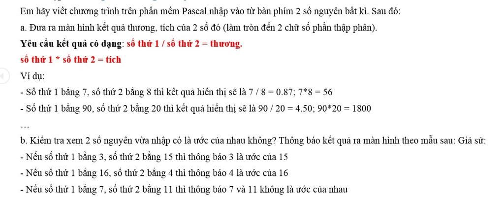 Em hãy viết chương trình trên phần mềm Pascal nhập vào từ bàn phím 2 số nguyên bất kì. Sau đó: