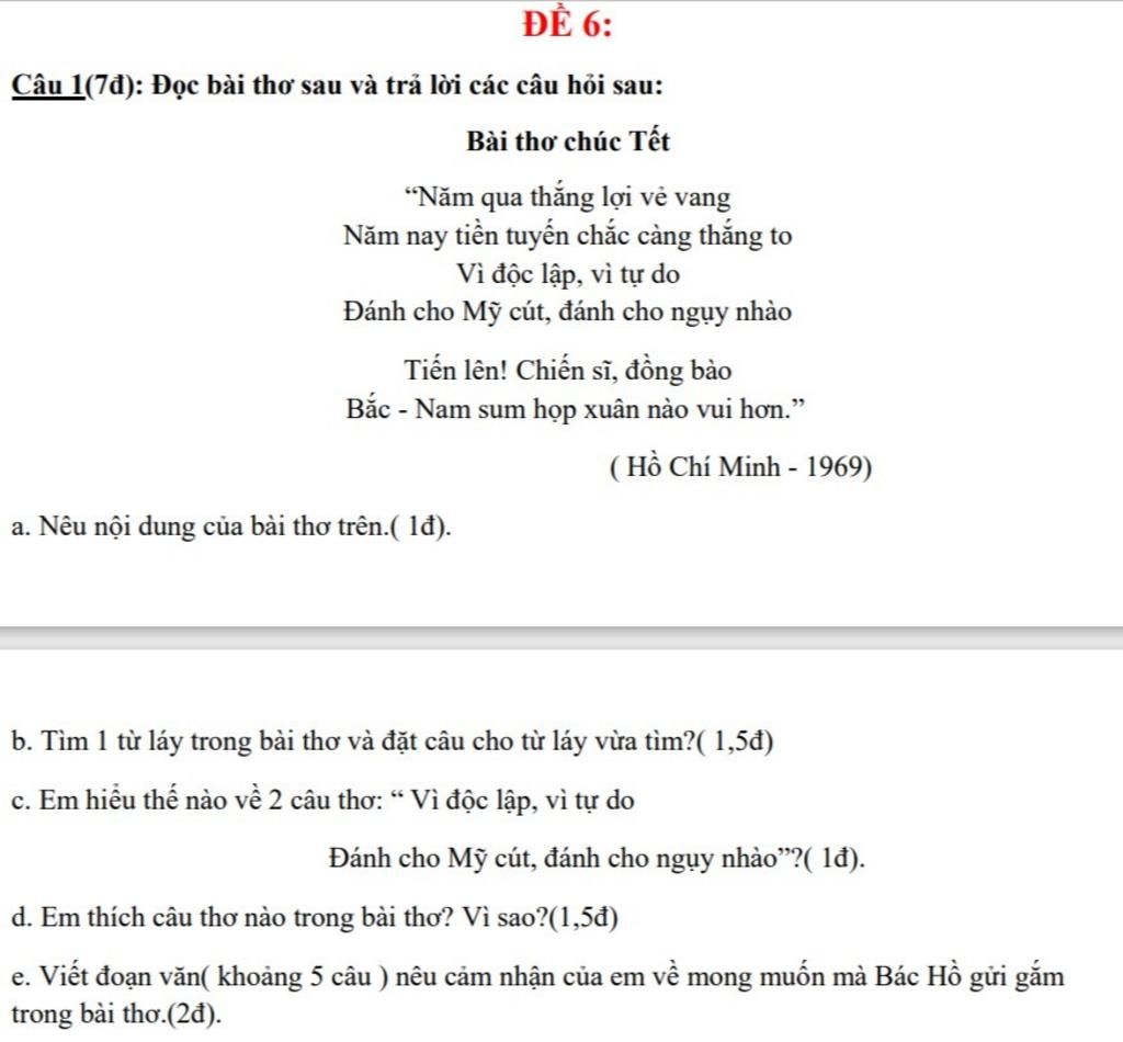 e/ Theo em, điều Bác Hồ muốn gửi gắm cho nhân dân ta qua bài thơ này là cần phải chiến thắng để được sum vầy bên gia đình, được sống một cuộc sống vui vẻ, hạnh phúc cùng con cháu