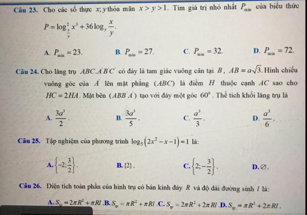 Câu 23. Cho các số thực x, y thỏa mãn x> y >1. Tìm giá trị nhỏ nhất P của biểu thức