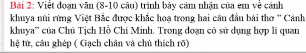Trong tất cả những bài thơ của Bác Hồ giai đoạn kháng chiến thì em thích nhất là bài “Cảnh khuya”. Mặc dù bài thơ chỉ vỏn vẹn 4 câu thơ, nhưng đã vẽ nên một bức tranh thiên nhiên tuyệt đẹp ở núi rừng Việt Bắc, có rừng cây, có trăng sáng, có tiếng suối, và đặc biệt có một người đang ở đó thao thức không ngủ được vì lo lắng cho sự an nguy của nước nhà.