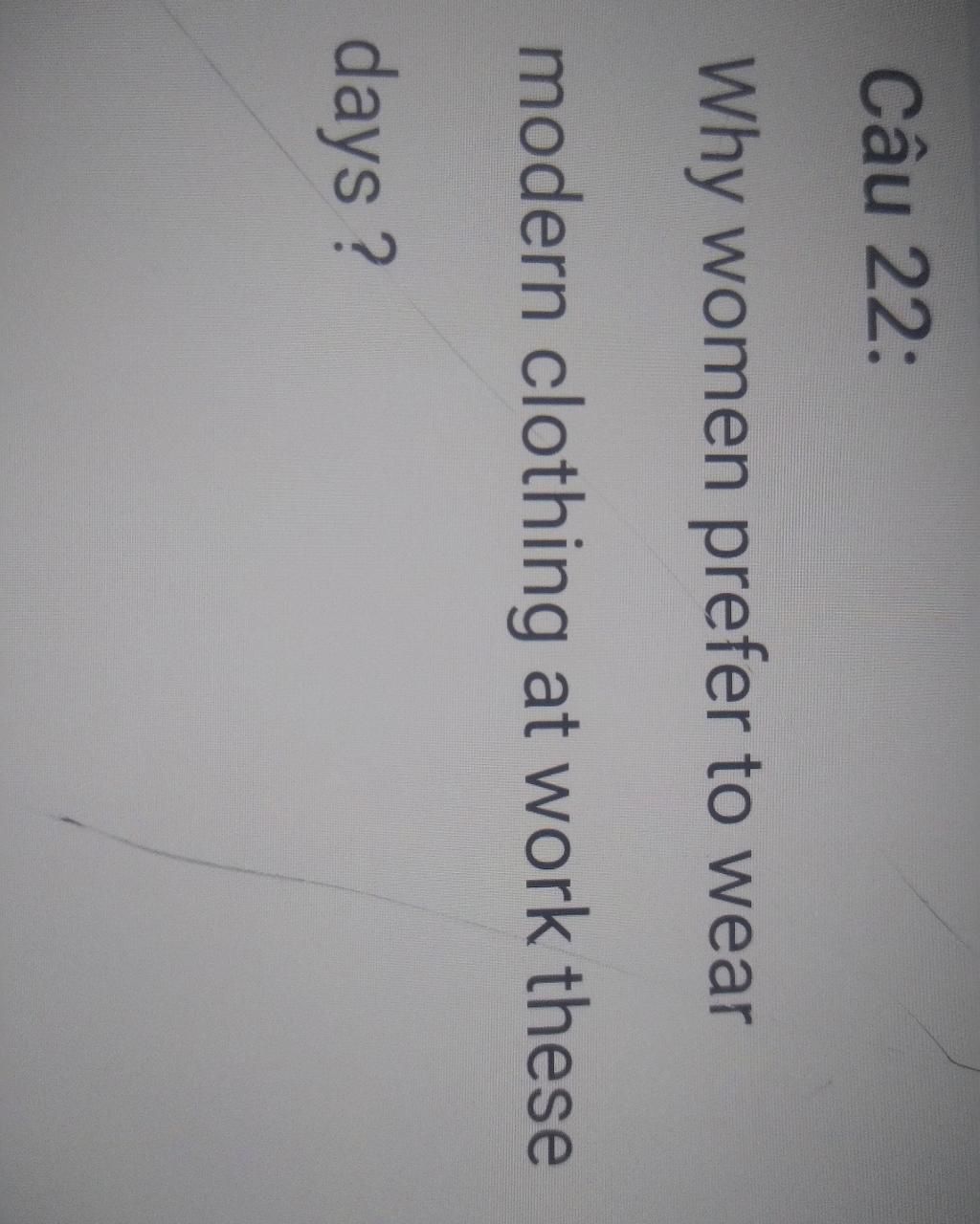 Câu 22: Why women prefer to wear modern clothing at work these days?