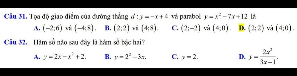 Câu 31. Tọa độ giao điểm của đường thắng d: y =-x+4 và parabol y = x -7x+12 là