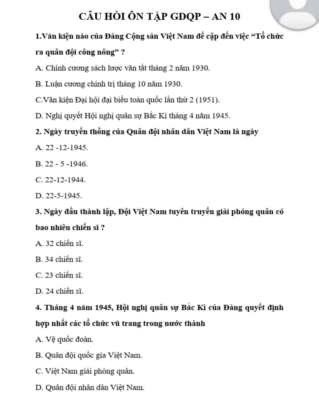 $\text{2)Ngày truyền thống của Quân đội nhân dân Việt Nam là ngày 22/12/1944}$