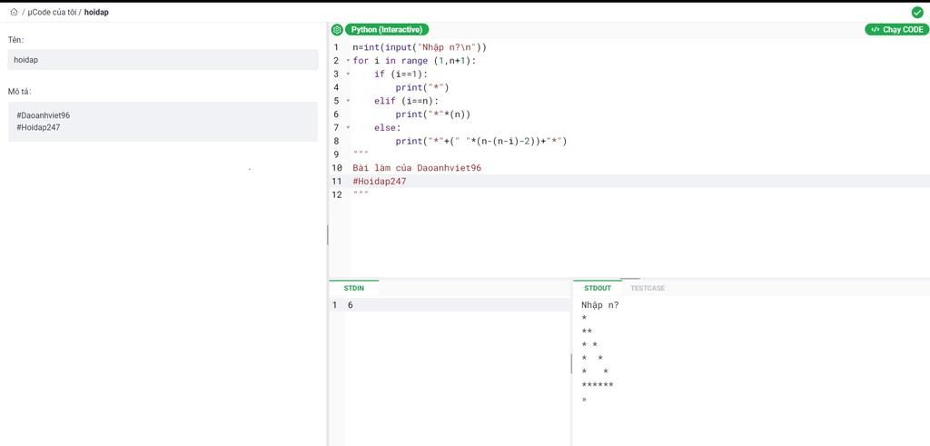n=int(input("nhập cạnh tam giác cân:")) print("Vẽ tam giác cân:") print("*") for i in range(1,n-1): print("*",end='') print((i-1)*" ","*") for t in range(n-1,0,-1): print("*",end='') print((t-1)*" ","*") print("*")