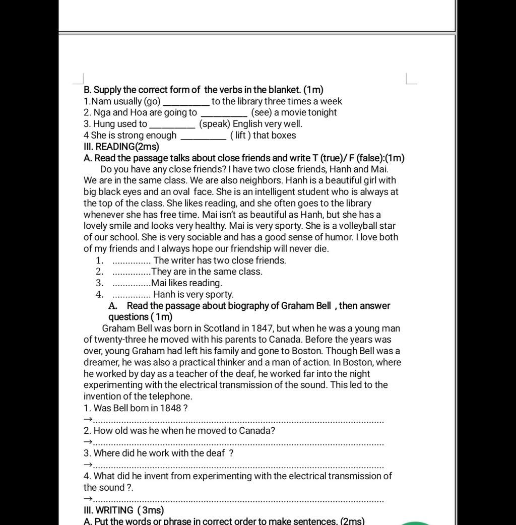 A. Read the passage talks about close friends and write T (true)/F (false):(1m)