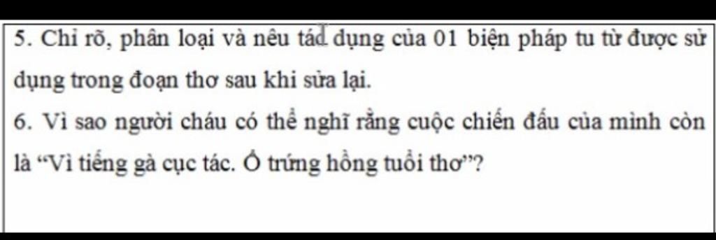 Câu 5: Chỉ rõ, phân loại và nêu tác dụng của 1 biện pháp tu từ được sử dụng trong đoạn thơ sau: ''Cháu chiến đấu hôm nay/..../Ổ trứng hồng tuổi thơ"
