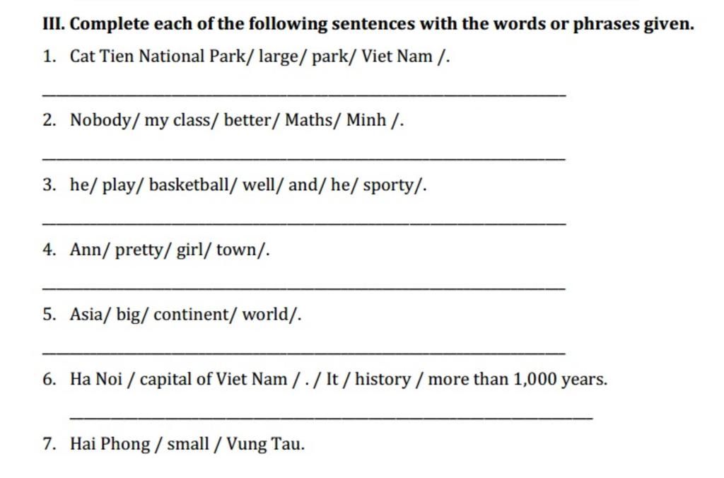 III. Dùng từ gợi í viết câu hoàn chỉnh