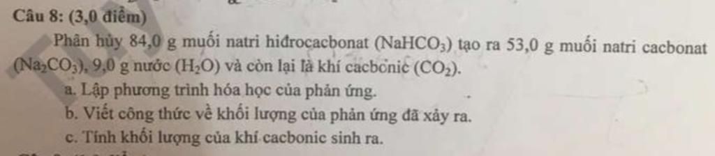 Phân hủy 84,0 g muối natri hidrocacbonat (NaHCO;) tạo ra 53,0 g muối natri cacbonat