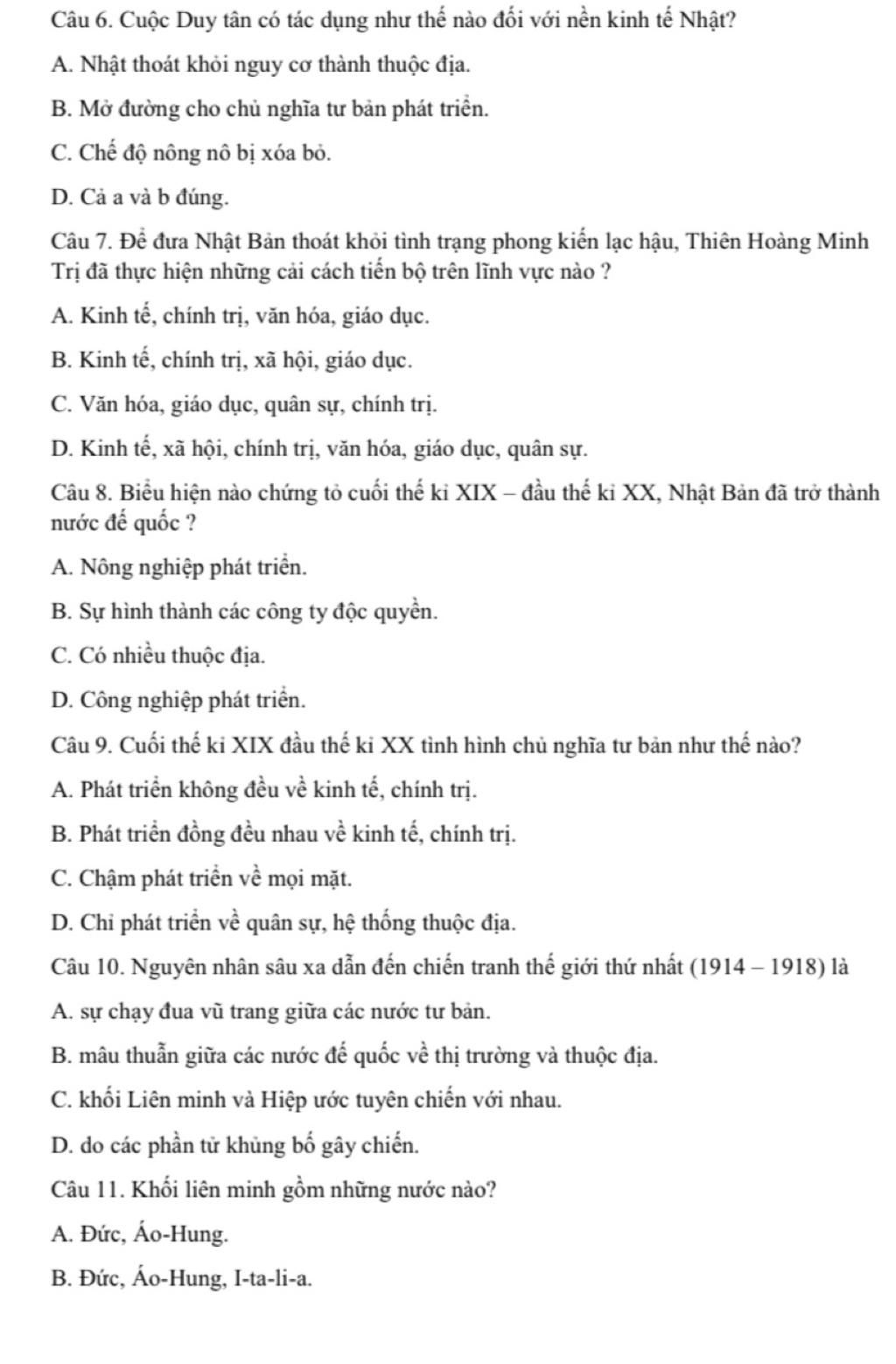 Câu 6 : A. Nhật thoát khỏi nguy cơ thuộc địa