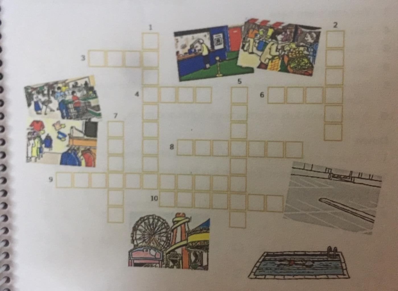 1.Classroom:lớp học2.Market :chợ3.Pool:bể bơi4.Shop:cửa hàng5.Hospital:bệnh viện6.Bank:Ngân hàng7.Cinema:rạp chiếu phim8.Carpark:Bãi đậu xe