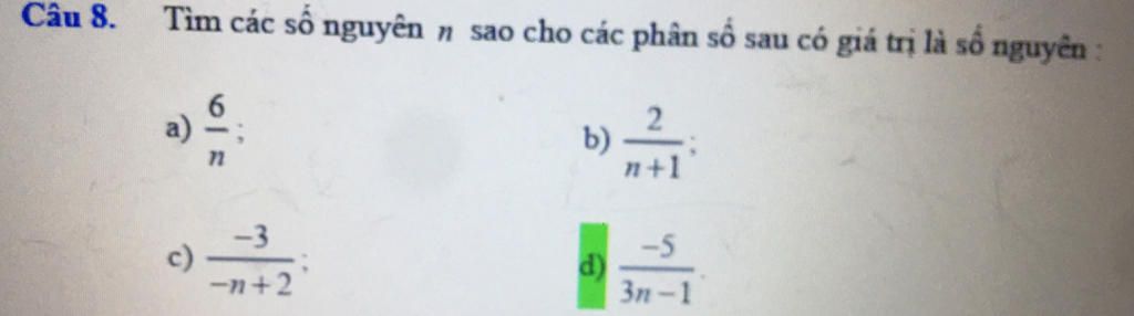 $ d) \dfrac{-5}{3n-1} ∈ Z ⇒ -5 ⋮ 3n-1 ⇒ 3n-1= ±1;±5 ⇒ 3n = 0;2;-4;6 ⇒ n = 0;2 $