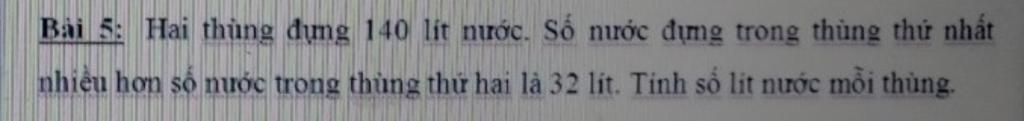 Đáp số : Thùng thứ nhất : `86 l` , Thùng thứ hai : `54 l`