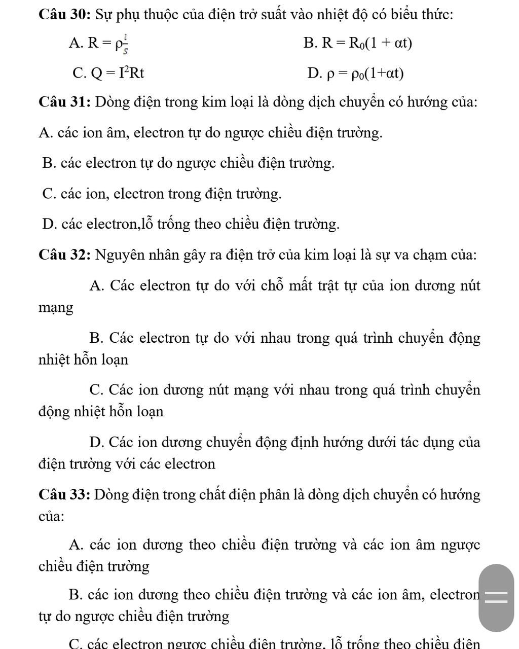 - Câu 32: Nguyên nhân gây ra điện trở kim loại là các ion dương nút mạng chuyển động với các electron.
