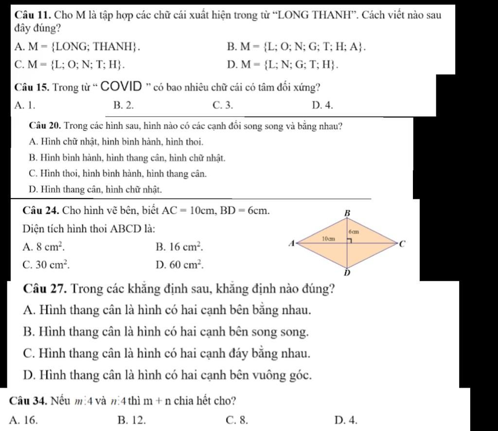 Cầu 11. Cho M là tập hợp các chữ cái xuất hiện trong từ “LONG THANH". Cách viết nào sau