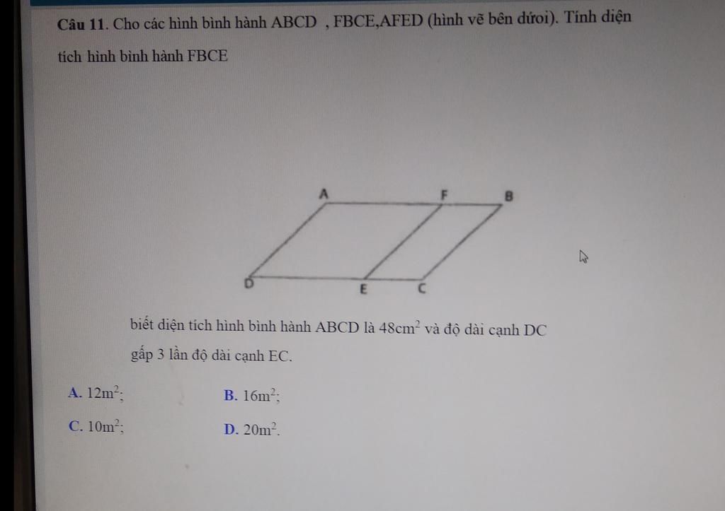 Diện tích hình bình hành `FBCE = 1/3` diện tích hình bình hành `ABCD` ( Vì `AD = BC` và `EC = 1/3 DC` )