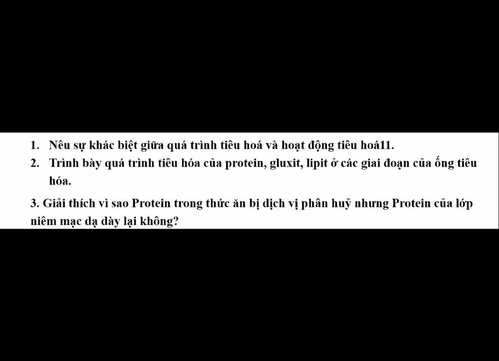 -> Prôtêin, lipit, gluxit.… : bị biến đổi hóa học trong quá trình tiêu hóa. Chất vô cơ: Nước, muối khoáng: không bị biến đổi hóa học trong quá trình tiêu hóa. Quá trình tiêu hóa gồm các hoạt động: Ăn và uống → đẩy thức ăn vào ống tiêu hóa → tiêu hóa thức ăn → hấp thụ chất dinh dưỡng → thải phân.