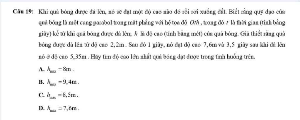 Câu 19: Khi quả bóng được đá lên, nó sẽ đạt một độ cao nào đó rồi rơi xuống đất. Biết rằng quỹ đạo của