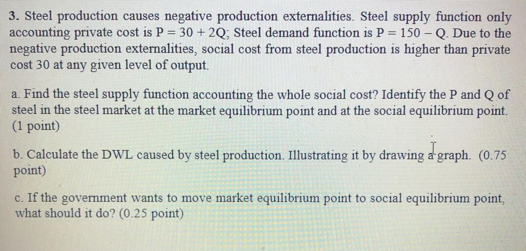accounting private cost is P = 30 + 2Q; Steel demand function is P 150 - Q Due to the