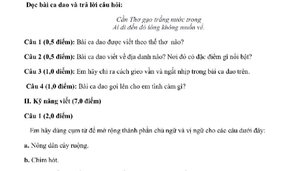 Câu 1 (0,5 điểm): Bài ca dao được viết theo thể thơ nào?