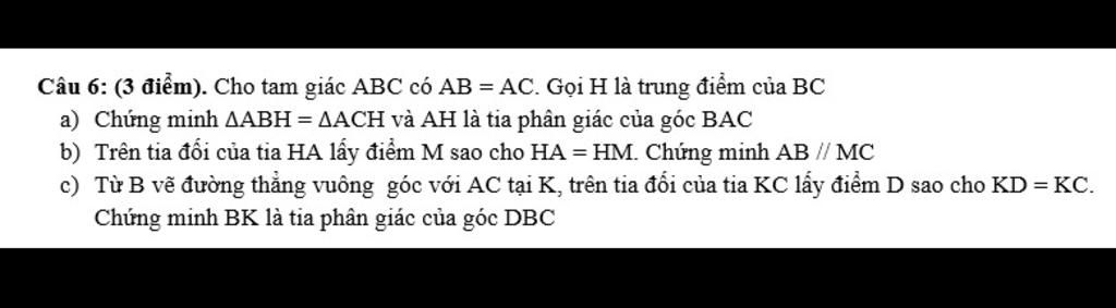 `⇒ hat{HCM}=hat{HBM}` ( 2 góc tương ứng ) mà hai góc này ở vị trí so le trong nên ` AB////MC` ( điều phải chứng minh )