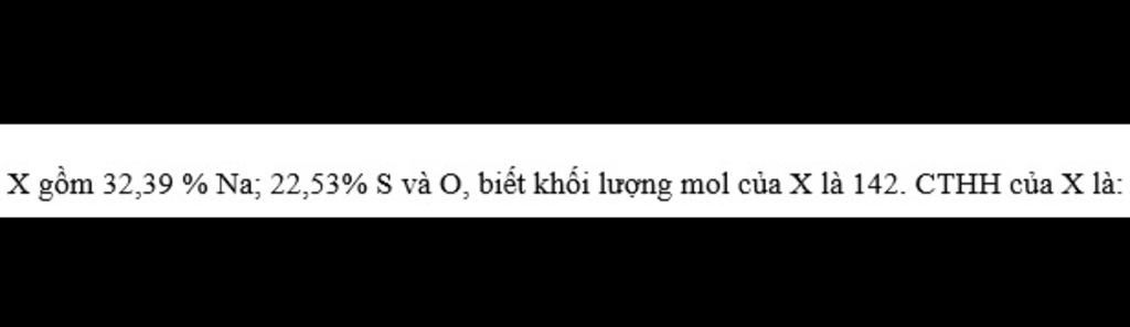 $\begin{cases} m_{Na}=142.32,39\%=46(g)\Rightarrow n_{Na}=\dfrac{46}{23}=2(mol)\\ m_S=142.22,53\%=32(g)\Rightarrow n_S=\dfrac{32}{32}=1(mol)\\ m_O=142-1.32-2.23=64(g)\Rightarrow n_O=\dfrac{64}{16}=4(mol) \end{cases}\\ \Rightarrow CTHH_X:Na_2SO_4$