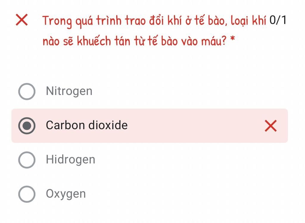 Giải thích: Trao đổi khí ở tế bào gồm sự khuếch tán của O2 từ máu vào tế bào và của CO2 từ tế bào vào máu.