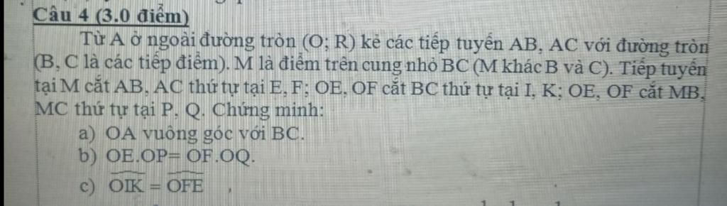 (B, C là các tiếp điểm). M là điểm trên cung nhỏ BC (M khác B và C). Tiếp tuyến