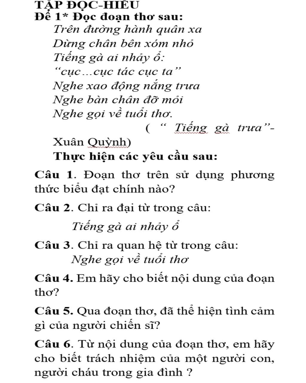 - Qua đoạn thơ trên đã miêu tả thể hiện tình cảm của người chiến sĩ : tiếng gà trưa khơi dậy những cảm xúc trong lòng người lính