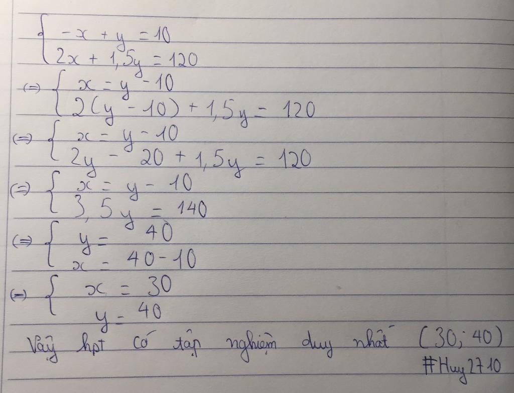 Vậy hệ phương trình có nghiệm duy nhất `(x;y)=(30;40)`
