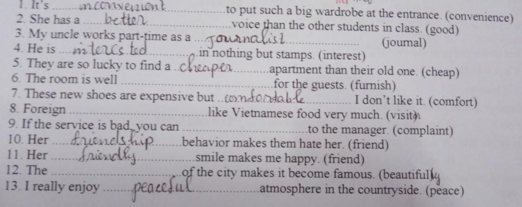 ⇒ furnish (adj) : Sự tiện nghi → furnished (v) : trang bị