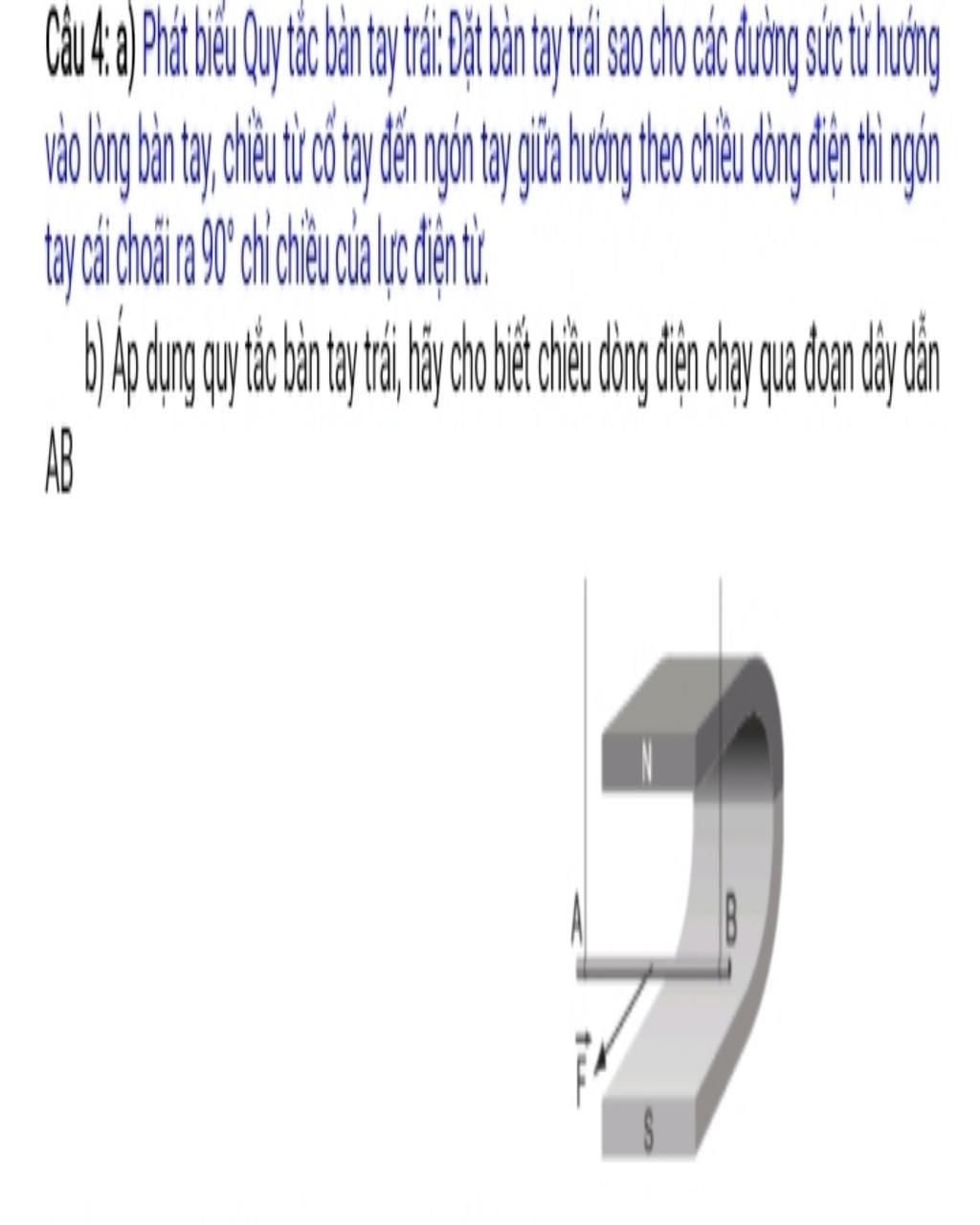 $\\$ Đặt bàn tay trái sao cho các đường sức từ hướng vào lòng bàn tay, chiều từ cổ tay đến ngón tay giữa hướng theo chiều dòng điện thì ngón tay cái choãi ra `90^o` chỉ chiều của lực điện từ