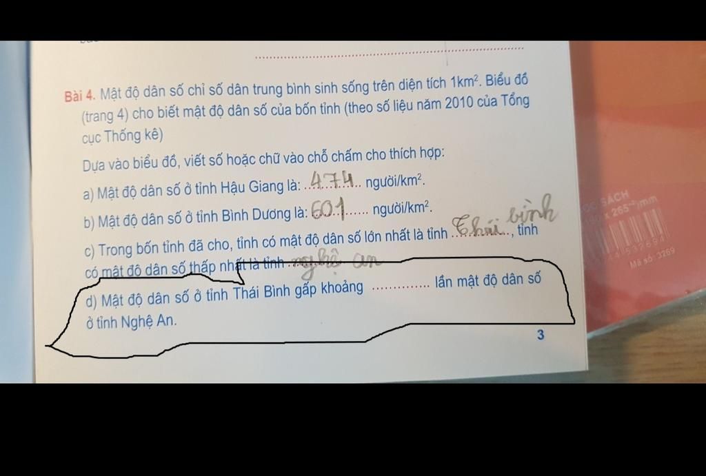 ⇒ Mật độ dân số ở tỉnh Thái Bình gấp khoảng 10 lần mật độ dân số ở tỉnh Nghệ An.