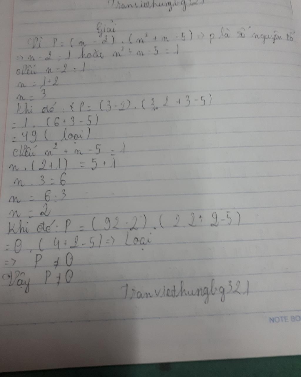 Vì p = (n-2).(n^2+n-5);p là số nguyên tố