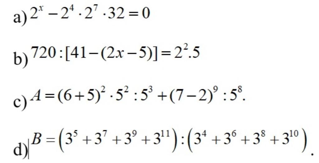 $a)\,2^x-2^4.2^7.32=0\\\Rightarrow 2^x-2^{11}.2^5=0\\\Rightarrow 2^x-2^{16}=0\\\Rightarrow 2^x=2^{16}\\\Rightarrow x=16\\b)\,720:[41-(2x-5)]=2^2.5\\\Rightarrow 720:[41-(2x-5)]=20\\\Rightarrow 41-(2x-5)=36\\\Rightarrow 2x-5=5\\\Rightarrow 2x=10\\\Rightarrow x=5\\c)\,A=\left(6+5\right)^2.5^2:5^3+\left(7-2\right)^9:5^8\\\Rightarrow A=11^2 \!\cdot\!\dfrac15+5^9:5^8\\\Rightarrow A=\dfrac{121}5+5\\\Rightarrow A=\dfrac{146}5\\d)\,B=\dfrac{3^5+3^7+3^9+3^{11}}{3^4+3^6+3^8+3^{10}}\\\Rightarrow B=\dfrac{3^5(1+3^2+3^4+3^6)}{3^4(1+3^2+3^4+3^6)}\\\Rightarrow B=3$