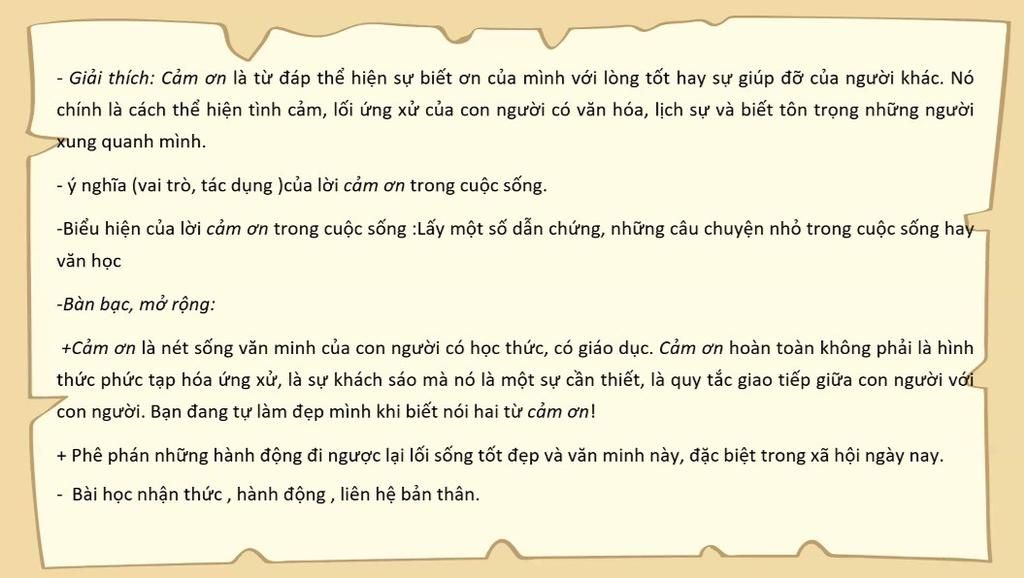 Tóm lại, nói lời “cảm ơn” là một nét đẹp trong văn hóa ứng xử của con người, là một hành động cần thiết trong những mối quan hệ giao tiếp hằng ngày. Nhưng phải nhớ rằng, lời nói luôn phải thống nhất với hành động cụ thể, phải xuất phát từ tận đáy lòng chân thành, tránh lối nói sáo rỗng, khẩu hiệu. Mỗi người chúng ta càng không nên dè sẻn lời cảm ơn mà ngược lại, hãy nói “cảm ơn” khi cần thiết. Nếu chúng ta biết cảm ơn những người xung quanh thì những mối quan hệ đó sẽ tốt hơn rất nhiều.