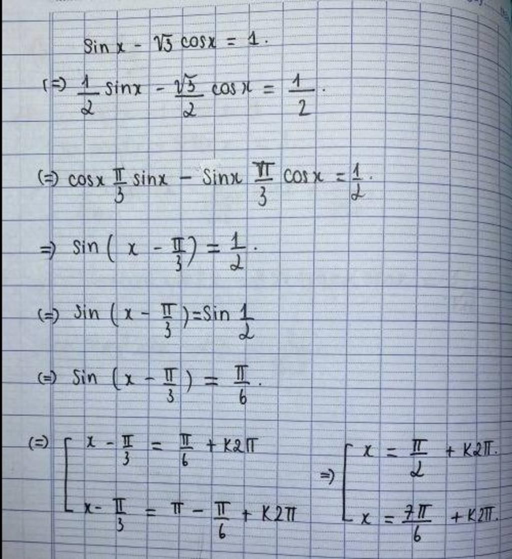 $\text{ ⇔ \(\left[ \begin{array}{l}x - \frac{π}{3} = \frac{π}{6} + k2π\\x - \frac{π}{3} = π - \frac{π}{6} + k2π\end{array} \right.\) (k∈Z) }$