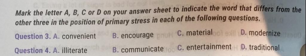 Câu 3 chọn D vì nó rơi vào âm tiết thứ 1 .Đáp án còn lại rơi vào âm tiết thứ 2