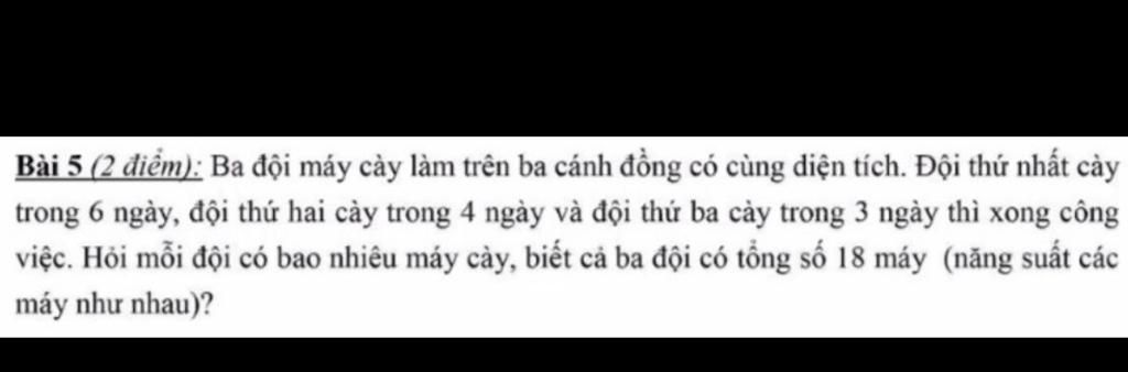 $\text{Vì cùng 1 diện tích cành đồng như nhau nên số máy cày và số ngày là hai đại lượng tỉ lệ nghịch nên ta có:}$