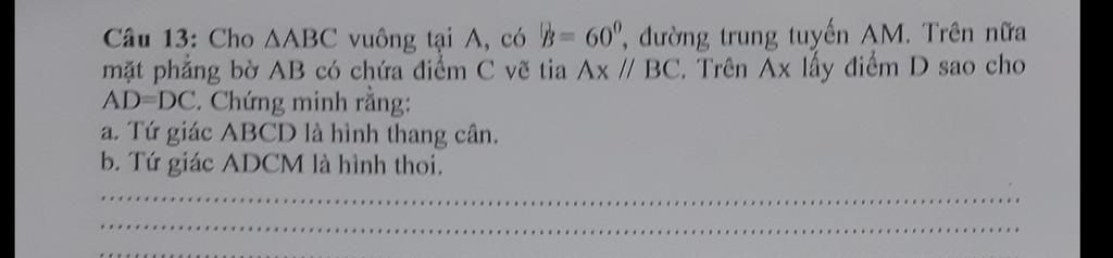 Câu 13: Cho AABC vuông tại A, có = 60", dường trung tuyến AM. Trên nữa