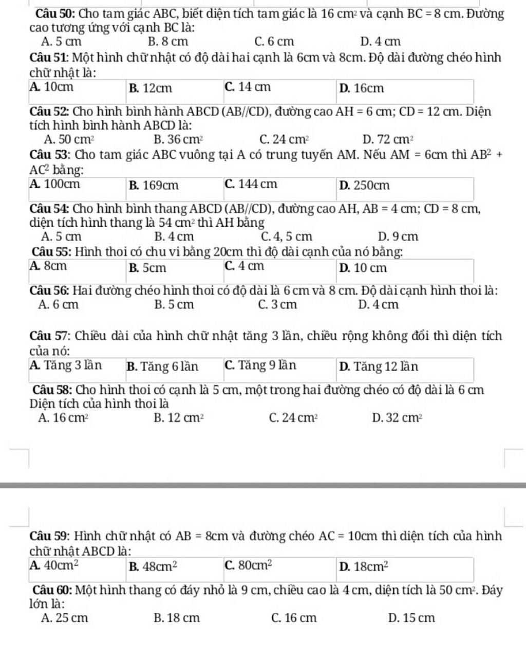 Câu 50: Cho tam giác ABC, biết diện tích tam giác là 16 cm và cạnh BC = 8 cm. Đường