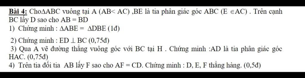 4) `AC⊥AB` (`ΔABC` vuông tại `A`); `F∈AB`