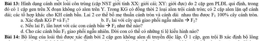 Bài 13: Hình dạng cánh một loài côn trùng (cặp NST giới tính XX: giới cái; XY: giới đực) do 2 cặp gen PLĐL qui định, trong
