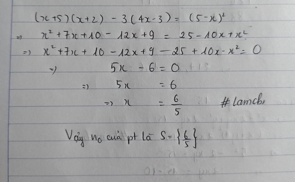 `( x + 5 )( x + 2 ) - 3 ( 4x - 3 ) = ( 5 - x )^2`