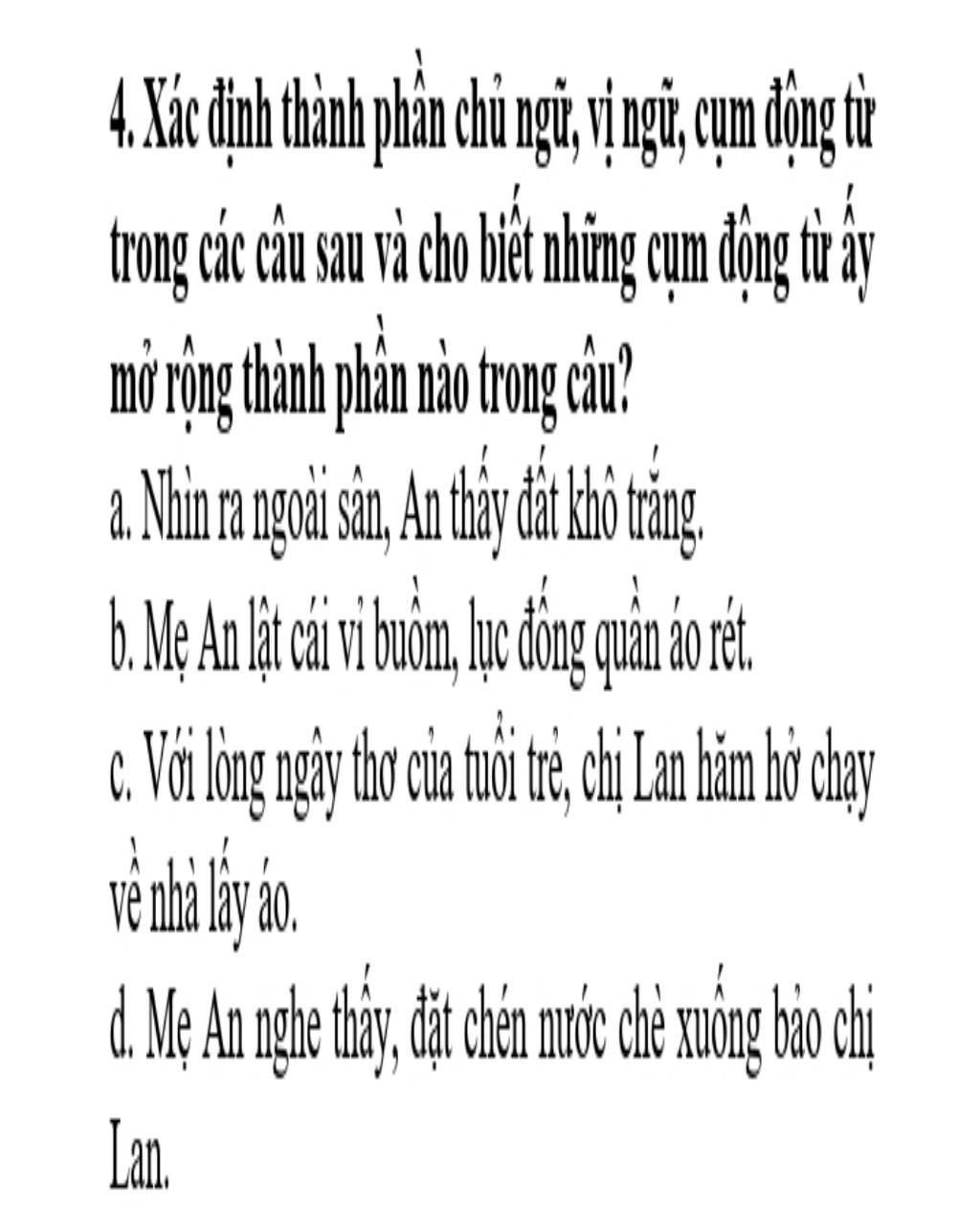 a.nhìn ra ngoài sân là trạng ngữ An là chủ ngữ, thấy đất khô trắng là vị ngữ. Nhìn ra ngoài sân là cụm động từ. Cụm động từ này mở rộng thêm phần vị ngữ.