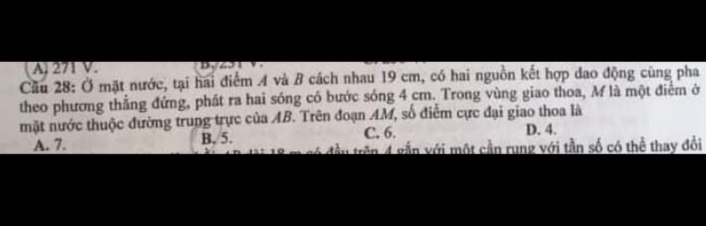 Cầu 28: Ở mặt nước, tại hai diểm A và B cách nhau 19 cm, có hai nguồn kết hợp dao đong cùng pha