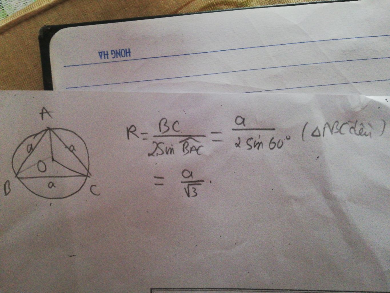 Bán kính R của đường tròn ngoại tiếp Δ ABC là: R=$\frac{BC}{2sinA^{∧}}$=$\frac{a}{2sin60^{o}}$=$\frac{a}{√3}$.