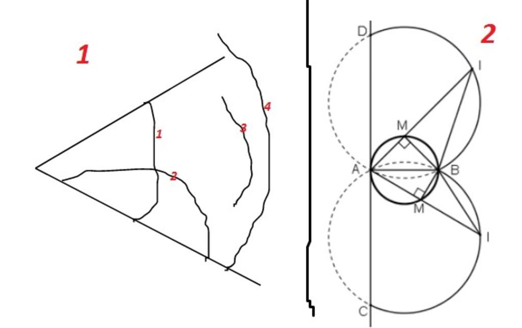 5. Quỹ tích điểm $I$ không là toàn bộ hai cung chứa góc dựng trên đoạn $AB$ do $M$ chạy trên đường tròn. Khi $M$ trùng $A$ thì $I$ là điểm $D$ hoặc $C$ ($\widehat{IMB}=90^o$ luôn không đổi), khi $M$ ra khỏi điểm $A$ thì $I$ tiến về $B$ nên $I$ không thể đi đến phần cung tròn nét đứt