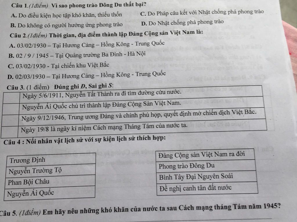 câu 4 trương định bình tây đâị nguyên soái, nguyễn trường tộ canh tân đất nước, phan bội trâu phong trào đông du,nguyễn ái quốc đảng cộng sản việt nam ra đời